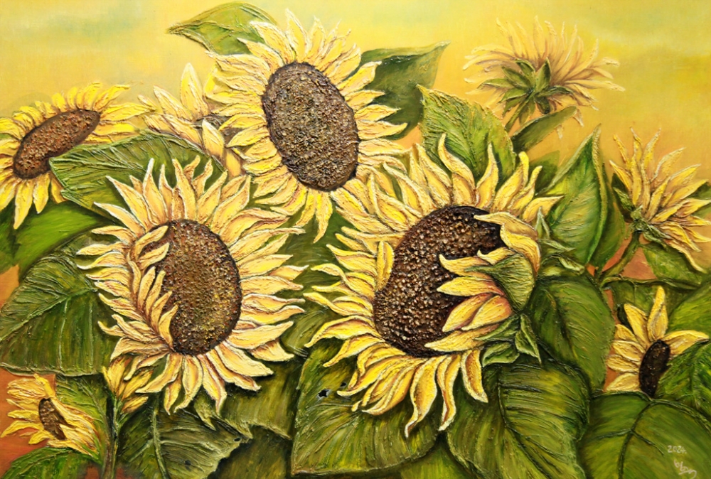 작품명 "올 가을"은 활짝 핀 해바라기 풍경을 정감 있는 표현으로 힐링의 시간을 전달하고 있는데, 해만 바라보는 꽃의 형상이 아닌 여러 개의 꽃 봉우리가 서로를 바라보며 사랑을 하고 행복의 미소를 짓는 다정한 모습으로 그렸다. 사람들의 삶도 함께 공존하며 살아가야 하는 의미를 전시 중인 여러 해바라기 작품에서 깨닫게 한다. 그림에는 단순한 정물적 차원을 넘어 바쁘게 살아가는 현대인들에게 잠시 쉼과 멈춤의 시간도 필요함을 느끼게 하는 철학적 요소를 녹여 따뜻함이 있다.