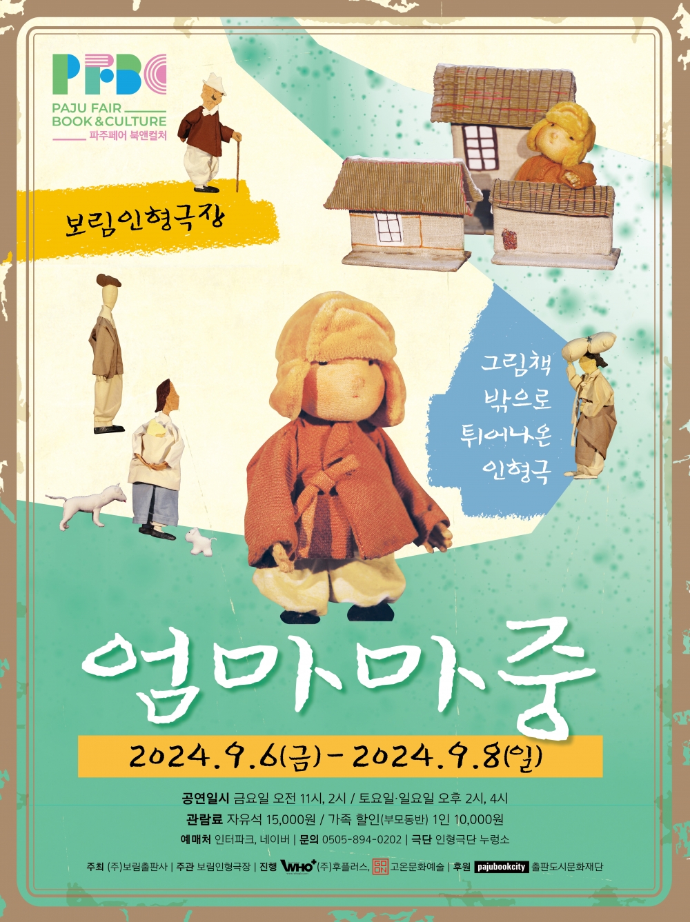 파주출판단지 보림 출판사의 베스트셀러 작품 "엄마마중" 파주페어 북앤컬쳐 (https://pajufair.com) 축제에 2024.9.6.(금)~8(일)에 엄마를 마중 나가 본 기억을 떠올리게 하는 창작 그림책<엄마 마중>을 인형극으로 새롭게 꾸며 인형극단 누렁소(대표 서해자)가 연출, 각색, 제작을 해서 참여 한다.