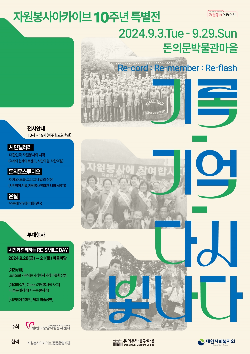 대한민국 자원봉사의 역사를 기록하고 공유하는 자원봉사아카이브의 개설 10주년 기념 특별전시가 2024년 9월 3일부터 29일까지 서울 돈의문박물관마을에서 열린다. 이번 전시는 ‘K-Volunteerism’을 찾는 기록의 여정이다. 대한민국 자원봉사의 뿌리를 되짚으며, 최신 자원봉사 트렌드까지 아우른다.