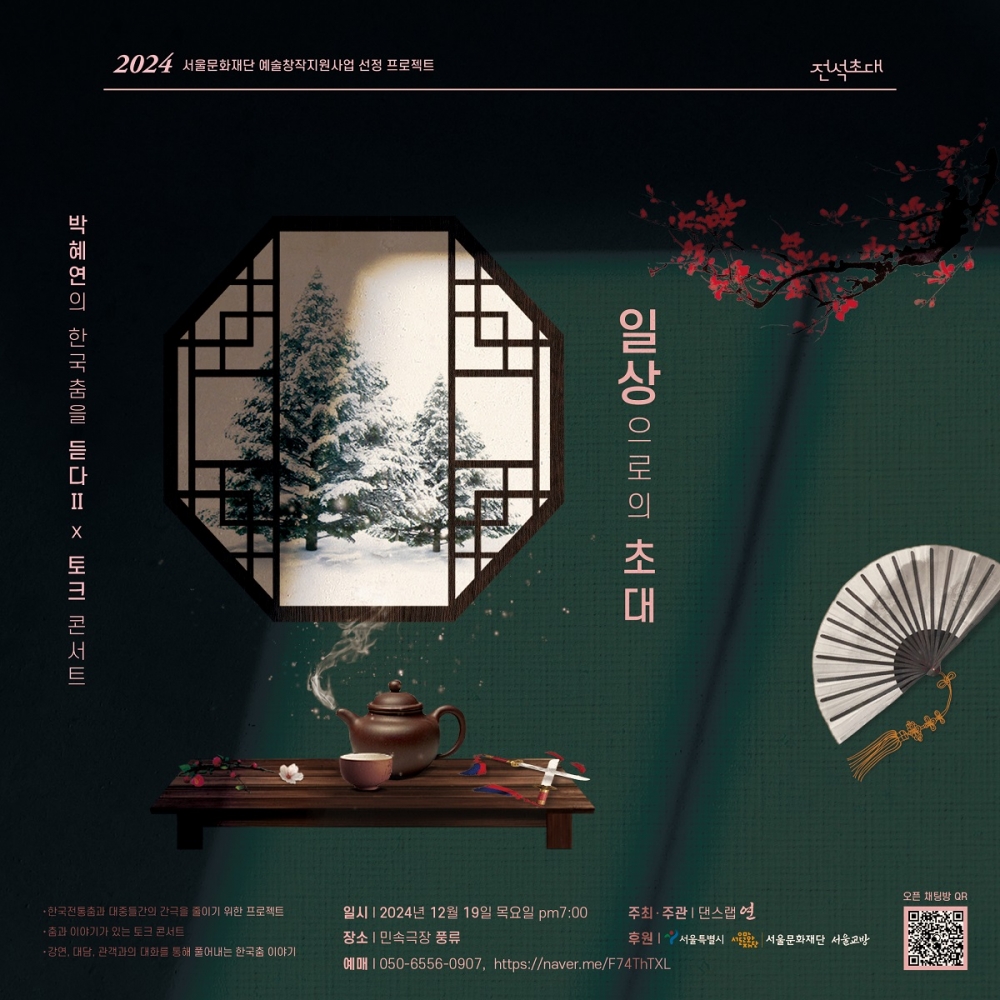 ‘박혜연의 한국춤을 듣다Ⅱ(토크 콘서트): 일상으로의 초대’ 공연은 전석 무료이며, 상세 정보 확인 및 예매는 ‘국가유산진흥원 홈페이지’에서 할 수 있다.