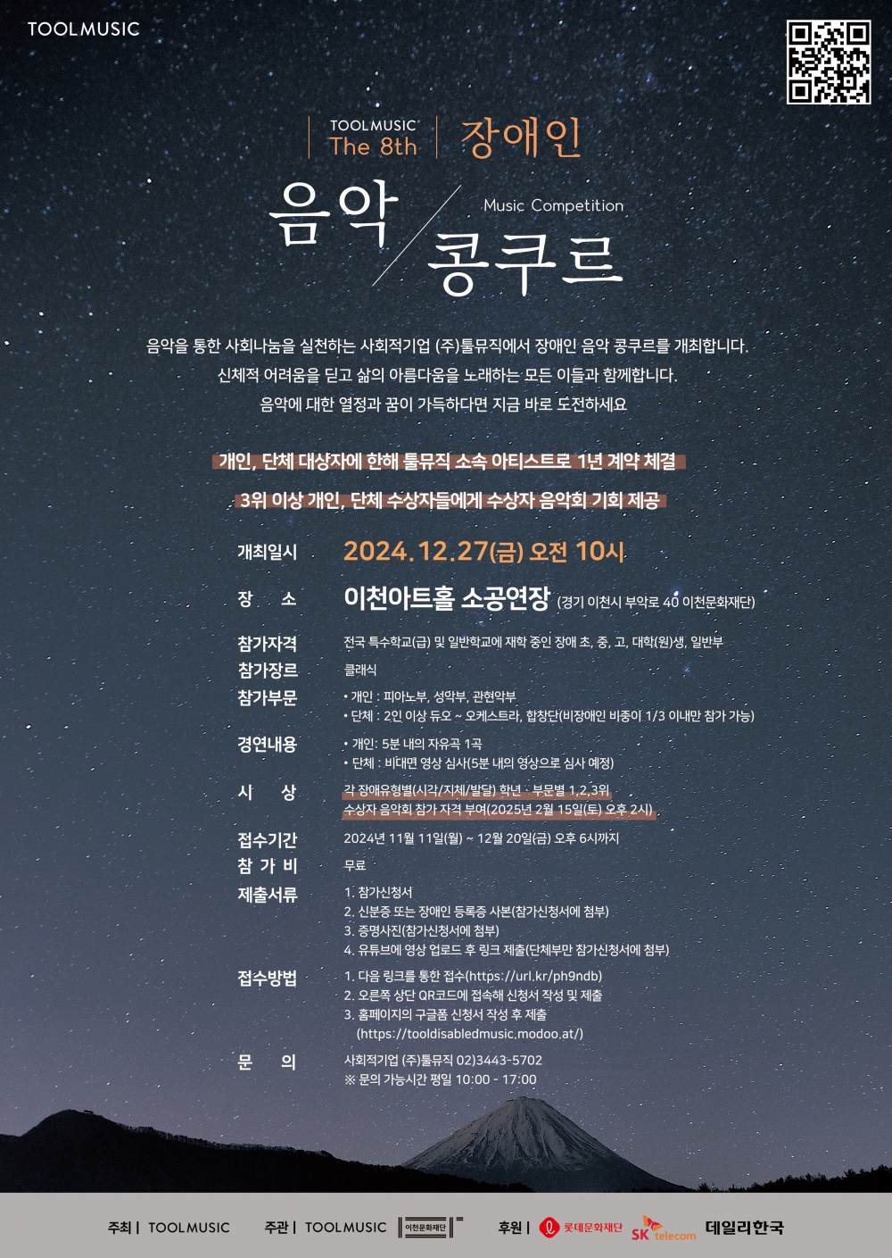 이번 콩쿠르는 개인 경연과 단체 경연으로 진행되며, 최고의 심사위원단이 참가자의 열정과 실력을 심사한다. 1위 수상자는 툴뮤직 소속 아티스트로서 1년 계약의 기회를 제공한다. 또한 3위 이내 수상자와 팀은 음악회 출연 기회를 얻을 수 있으며, 만 20세 이상 3위 이내 수상자는 기업의 요구에 따라 장애 음악인을 채용하려는 기업 연계 고용도 지원받을 수 있다.