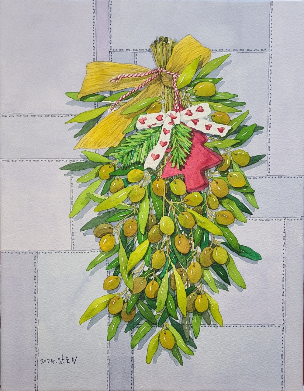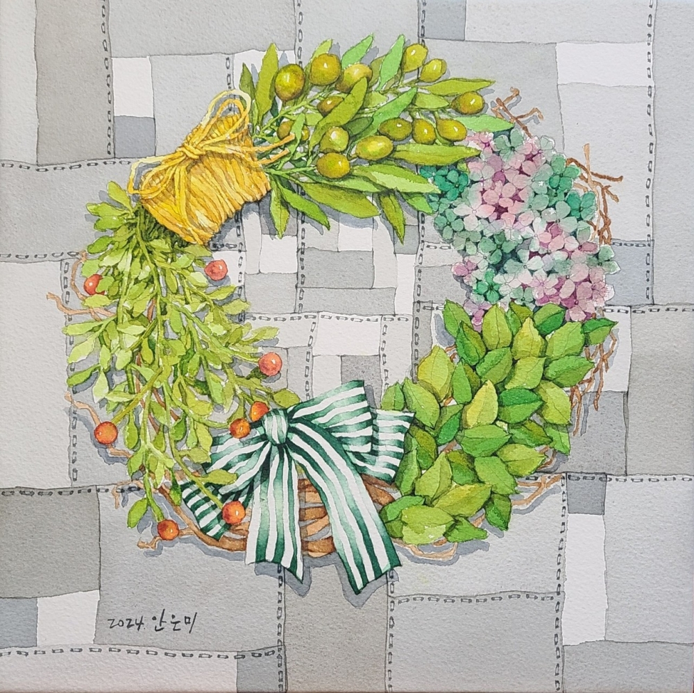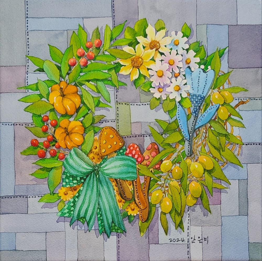 이번 전시에 안작가는 총 7개의 작품을 선보인다. 전시작 중 '풍성함 가득'은 평화와 번영, 풍요를 상징하는 올리브와 화사한 꽃들로 구성된 리스를 주제로 하고 있다. 수채화 특유의 투명하고 부드러운 색감이 리스의 자연스러운 아름다움과 따뜻한 감성을 극대화해 주목 할 만하다.