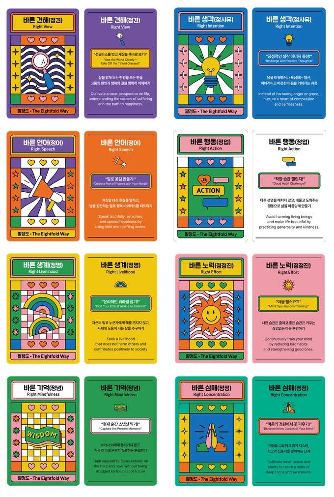 8장의 카드는 소셜 미디어에서 ‘꽃스님(@kkochsnim)’으로 널리 알려진 범정 스님(서귀포 해관사 주지)이 기획을 도왔다. ‘바른 노력’, ‘바른 견해’, ‘바른 생각’, ‘바른 언어’, ‘바른 행동’, ‘바른 생계’, ‘바른 기억’, ‘바른 삼매’로, 불교를 처음 접하는 사람도 팔정도의 가르침을 쉽게 이해할 수 있도록 현대적 언어로 재구성했다.