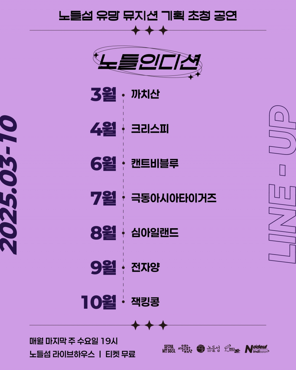 작년부터 서울문화재단이 운영을 맡은 노들섬은 그간 ‘서울서커스페스티벌’, ‘문화가 흐르는 노들’ 등 다양한 문화·예술 프로그램을 제공해 시민의 문화 접근성을 높이는데 기여했다. 이번 공연 시리즈를 통해 노들섬이 국내 인디음악 재도약의 시발점으로 자리매김할 수 있도록, 서울 중심부에 위치한 탁월한 접근성을 장점으로 인디음악의 역사적·예술적 가치를 널리 알릴 수 있도록 전시와 부대프로그램을 계속해서 이어갈 예정이다.