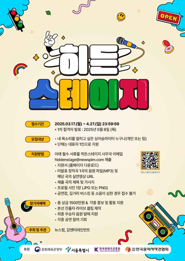 조동진과 김민기의 뒤를 이을 인재를 발굴하는 싱어송라이터 경연대회가 17일(오늘)부터 공모에 돌입한다. 올해로 3회째를 맞는 '히든 스테이지'는 청년 뮤지션들에게 재능을 펼칠 수 있는 무대를 마련하고, 인디 음악의 저변을 확대해 대중문화 산업 발전에 기여하고자 기획됐다. 뉴스핌과 감엔터테인먼트가 주최하고, 문화체육관광부·서울특별시·한국콘텐츠진흥원·한국음악저작권협회가 후원한다. 기성이나 신인 구분 없이 자신의 노래를 알리고 싶은 개인이나 팀이라면 누구나 나이, 성별, 국적에 관계없이 지원할 수 있다.