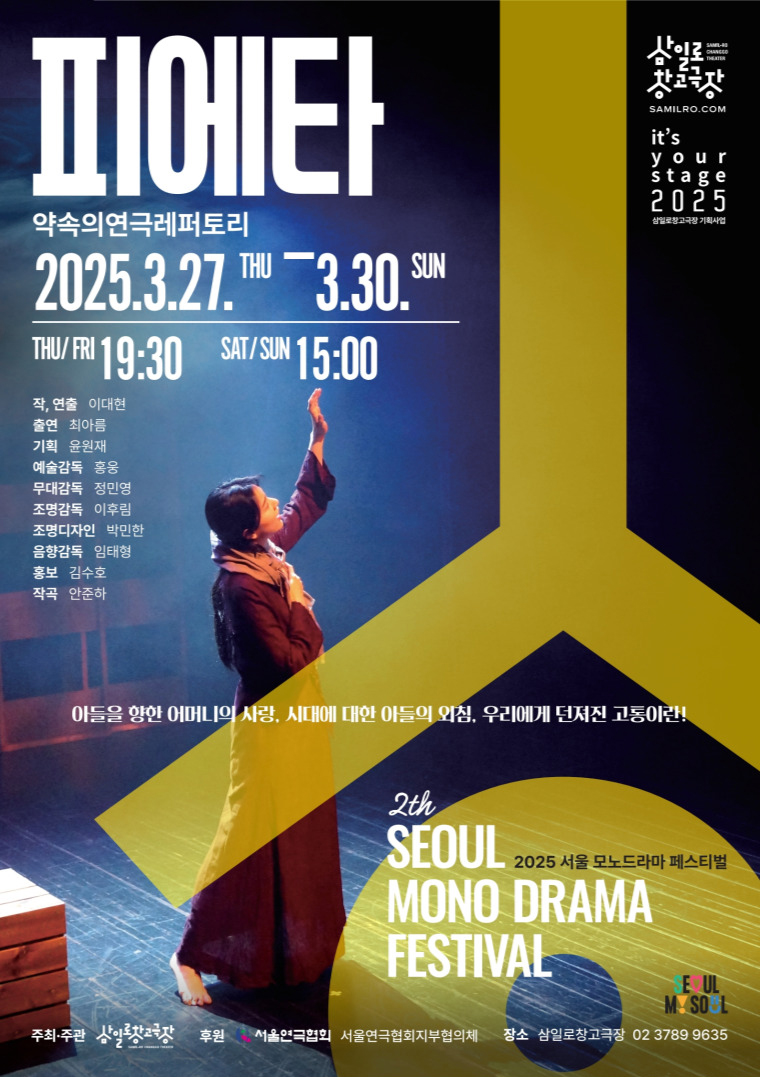 제2회 서울 모노드라마 페스티벌 참가작으로 오는 27일부터 30일까지 삼일로 창고극장에서 공연하는 약속의연극레퍼토리(대표 윤원재)의 모노드라마 ‘피에타’가 전석 매진됐다.