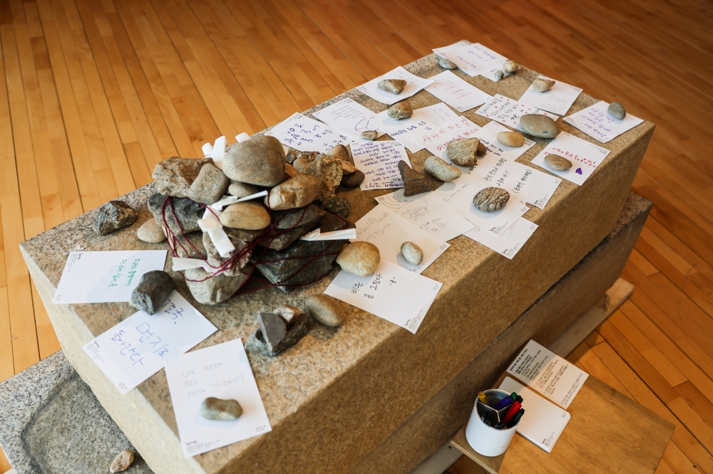 전시 참여작가 송미리내의 참여형 작품 ‘굴러온 돌, 박힌 돌’을 중심으로 펼쳐지는 이번 프로그램은 참여자가 ‘올림픽공원’의 돌을 오감으로 느끼고, 자연과의 교감을 글로 남기는 과정으로 구성된다. 향후 이 메시지들은 작가의 ‘텍스트 드로잉’ 신작 평면 회화에 반영돼 참여자들의 목소리가 예술로 남게 된다.