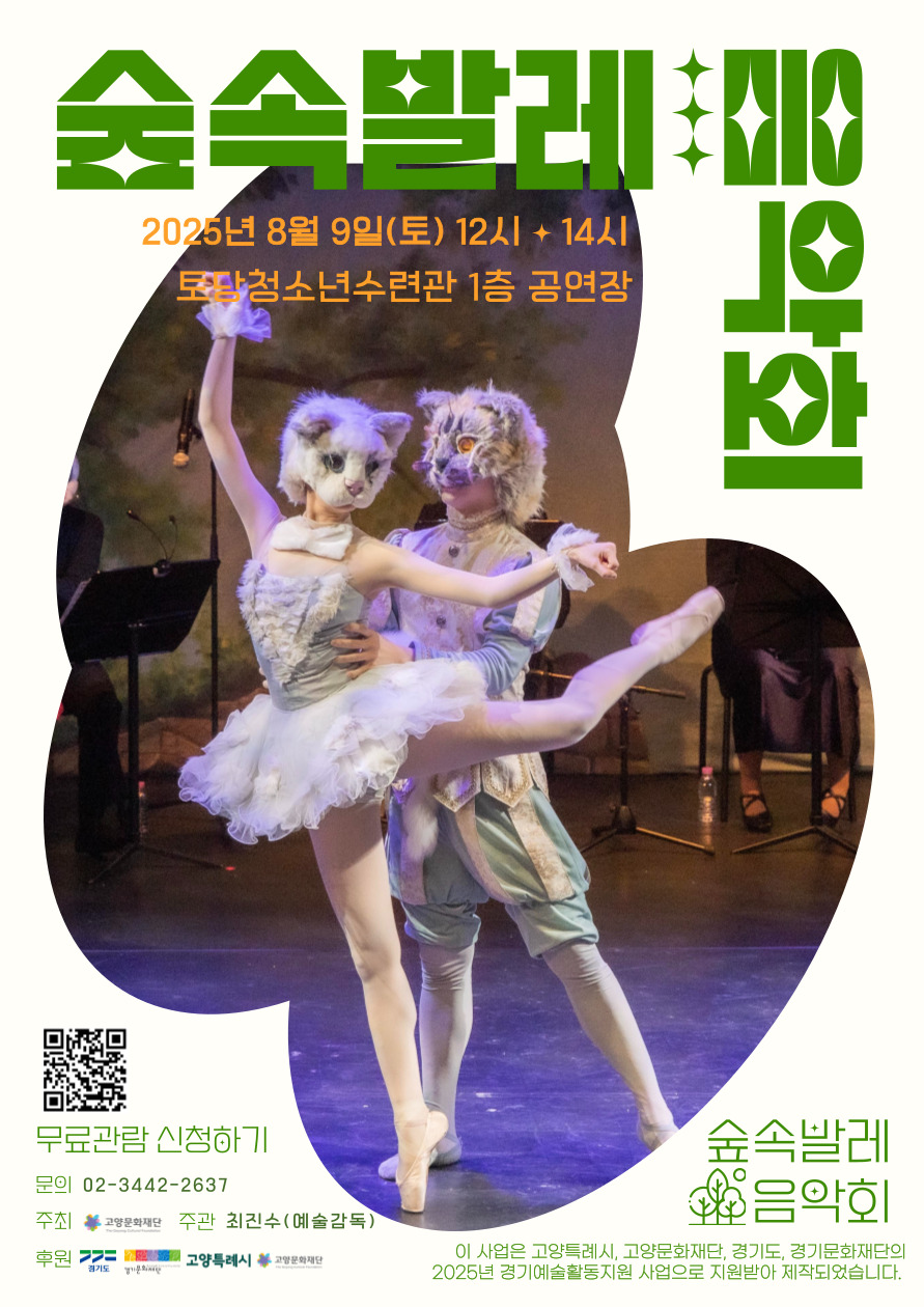 이번 공연은 고양시 문화예술진흥 지원사업의 일환인 '고양문화다리' 선정작으로, 고양시 예술가 최진수는 고양시민과 함께하는 예술 소통을 지속적으로 이어가고 있다. 최진수(고양시 예술가)는 “숲속발레음악회는 발레의 아름다움과 음악의 즐거움을 누구나 친근하게 느낄 수 있는 무대”라며, “온 가족이 함께 자연 속 상상력을 펼치며 특별한 예술의 순간을 경험하시길 바란다”고 전했다. 공연은 8월 9일(토) 12시/ 14시 고양시 토당청소년수련관 공연장에서 열리며, 관람 연령은 4세 이상이다. 티켓은 전석 무료로 제공된다.