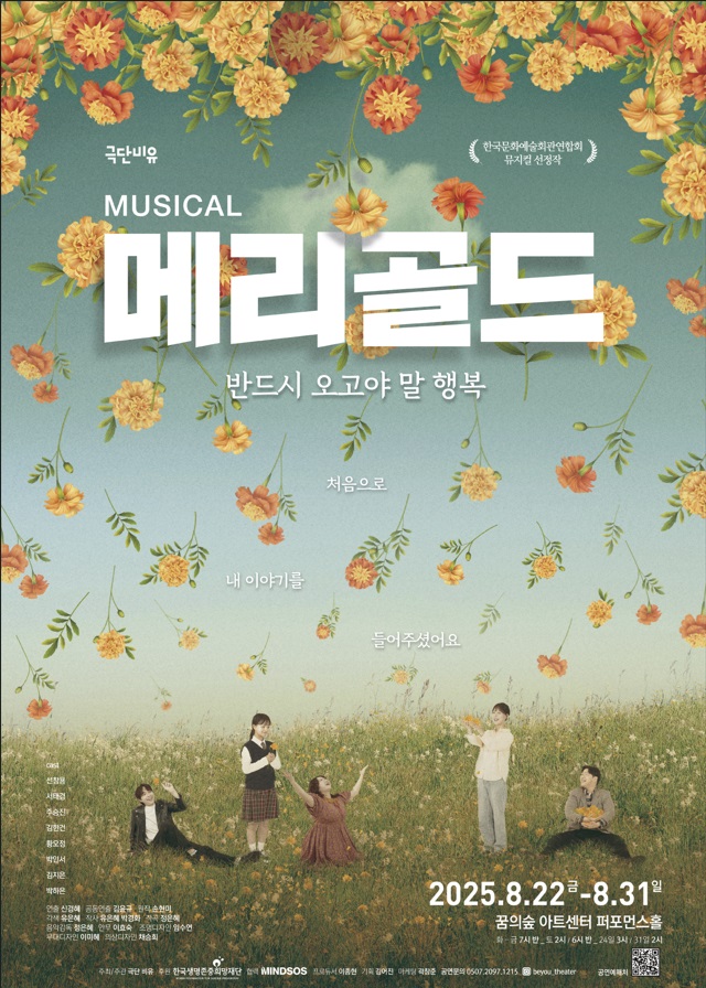 ‘메리골드’는 2014년 초연된 이후 꾸준히 생명존중의 가치를 무대에 담아왔으며, 올해 공연은 한국문화예술회관연합회가 선정한 뮤지컬 작품으로서 다시 한 번 공공예술로서의 의미를 더했다. ‘반드시 오고야 말 행복’이라는 부제처럼 이 공연은 상실과 고립을 경험한 이들에게 작지만 단단한 희망을 건넨다.