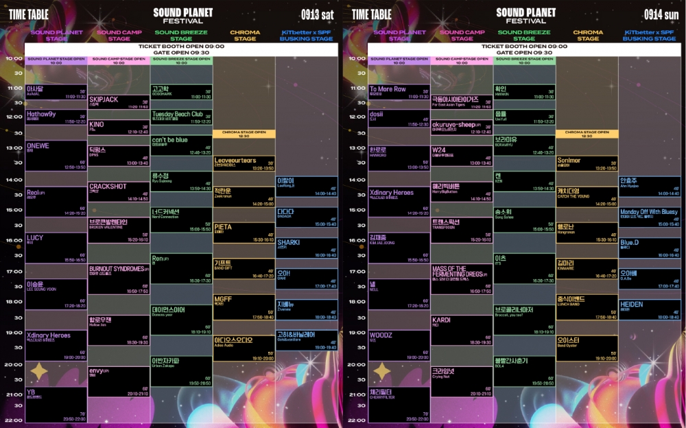 공개된 ‘사운드플래닛페스티벌 2025’의 타임테이블 중 사운드 플래닛 스테이지는 롤링홀의 4년째를 맞은 신인 뮤지션 발굴프로젝트 ‘CMYK 2025’의 TOP 2를 차지한 아사달과 투모로우가 각각 오프닝을 맡고 롤링홀과 오랜 시간 호흡을 맞춰온 YB와 체리필터가 대미를 장식한다. 대중성과 화제성을 모두 잡은 아티스트들도 다수 출연한다. 토요일에는 원위, 레오루, 루시, 이승윤이 일요일에는 도시, 한로로, 김재중, 넬, 우즈가 무대에 오른다. 엑스디너리히어로즈는 특별히 양일 모두 출연하며 이례적인 사례로 팬들의 이목을 끌었다.