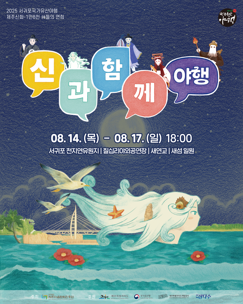 제주의 신화를 기반으로 유려한 자연경관과 역사 체험을 위해 기획된 ‘2025서귀포국가유산야행’은 사전 신청을 받은 프로그램 외에도 야경, 야로, 야설, 야사, 야화, 야시, 야식, 야숙 등 ‘8야’를 주제로 다양한 볼거리를 제공한다. 특히 신용구 작가가 구현한 ‘서천꽃밭’과 신화를 주제로 꾸민 ‘실경무용’ 그리고 홀로그램을 통해 구현한 영등할망의 방문은 밤바다와 신화가 어우러지는 잊지 못할 추억을 선사할 것이다. 이 외에도 다양한 아티스트들의 버스킹 무대와 어우러진 먹거리 장터도 열려 눈과 귀 그리고 미각까지 만족감을 선사할 예정이다.