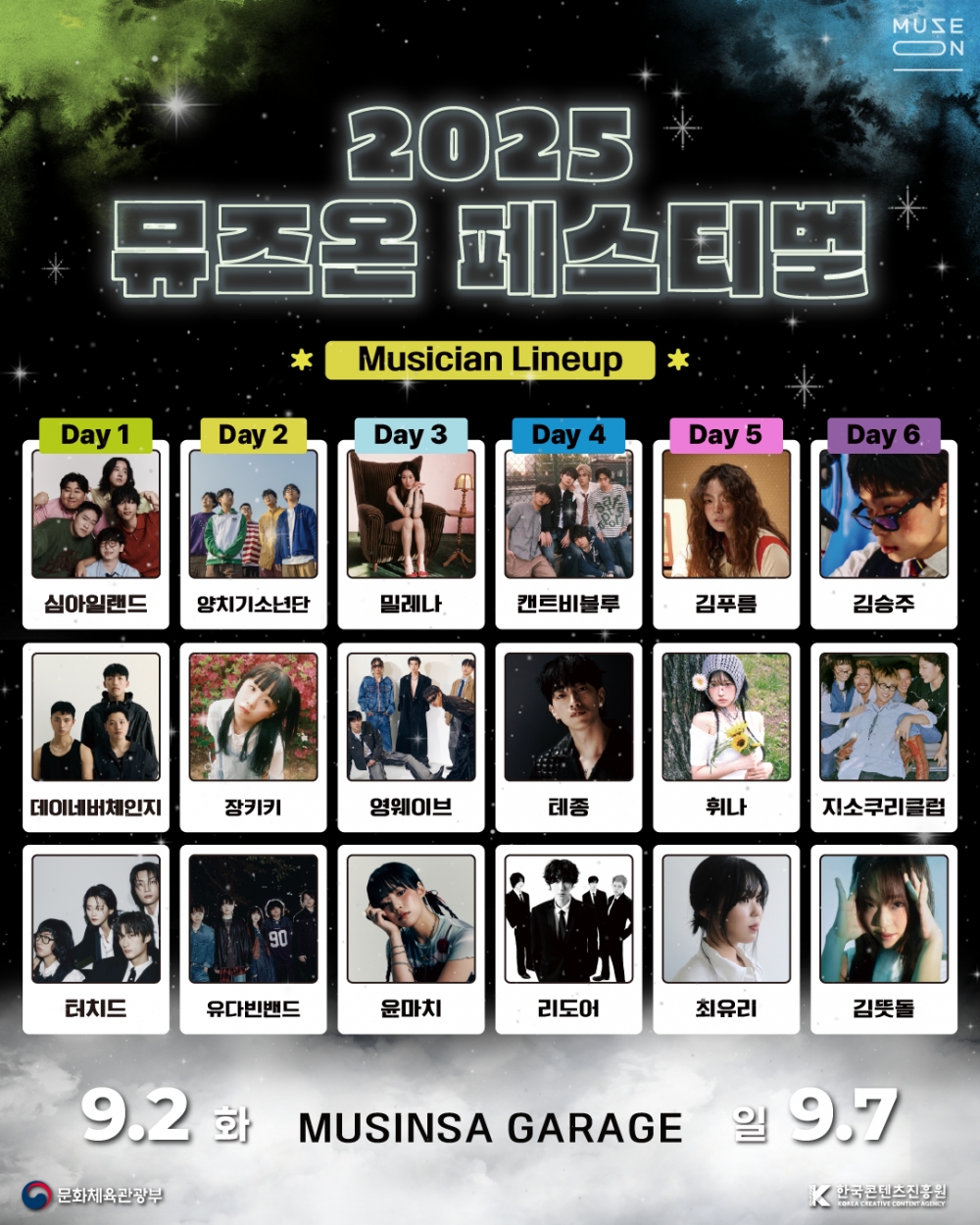 문화체육관광부(장관 최휘영)와 한국콘텐츠진흥원(원장직무대행 유현석, 이하 콘진원)은 국내 대표 인디 음악 축제 ‘2025 뮤즈온 페스티벌’을 9월 2일부터 7일까지 6일간 서울 합정 무신사 개러지에서 개최한다. 이번 페스티벌은 예매 시작 10분 만에 전석 매진을 기록하며 대중의 높은 관심과 신뢰를 입증했다.