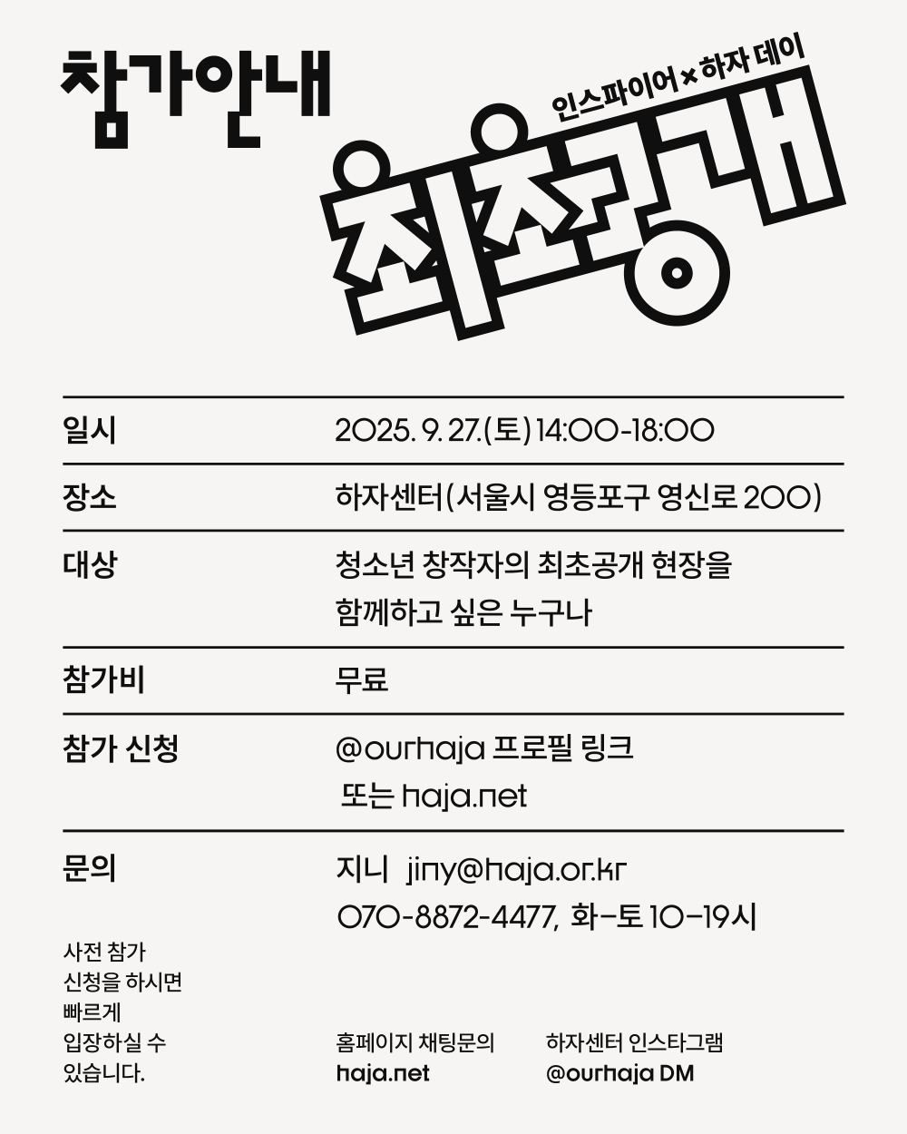 ‘2025 인스파이어✕하자 데이’는 청소년 창작자들을 더 넓은 사회적 데뷔무대를 통해 응원한다는 마음으로, ‘최초공개’라는 타이틀로 오는 9월 27일 토요일 오후 2시에서 6시까지 영등포구에 있는 하자센터에서 진행된다.