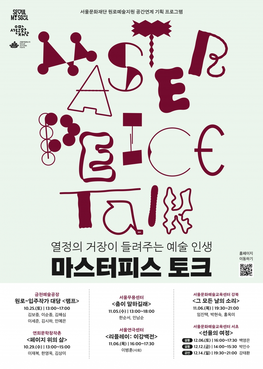 서울문화재단(대표이사 송형종)은 예술로 평생을 살아온 원로예술가들의 생애와 작품세계를 시민들과 공유하는 프로젝트 「마스터피스 토크(Masterpiece Talk)」를 오는 25일부터 12월까지 진행한다.