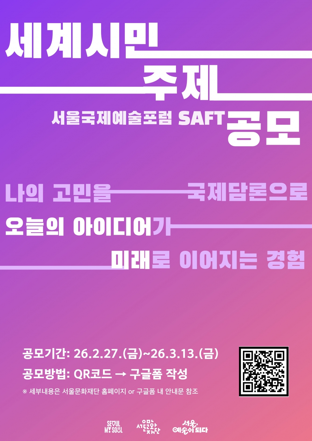 지난해 첫 개최한 SAFT는 서울에서 문화예술 정책과 환경의 미래를 논의하는 국제 담론의 장이다. 이번 SAFT 국제 주제 공모는 두 가지 트랙으로 진행된다. 첫 번째는 2027년 SAFT에서 다뤄야 할 미래 문화예술의 의제를 수집하는 공모이며, 두 번째는 오는 11월 ‘미래환경과 예술의 실존 ― AI 시대 예술의 가치와 인간의 몸’을 주제로 열리는 2026년 SAFT의 세부 아이디어를 제안하는 트랙이다. 재단은 이번 공모를 통해 문화예술 전문가뿐 아니라 일반 시민까지 참여 대상을 확대하여, 동시대를 살아가는 세계 시민의 문제의식을 포럼의 기획 단계부터 적극 반영할 계획이다. 주제 공모 접수는 한국 표준시(KST) 기준으로 오늘 27일(금)부터 3월 13일(금)까지 진행된다.