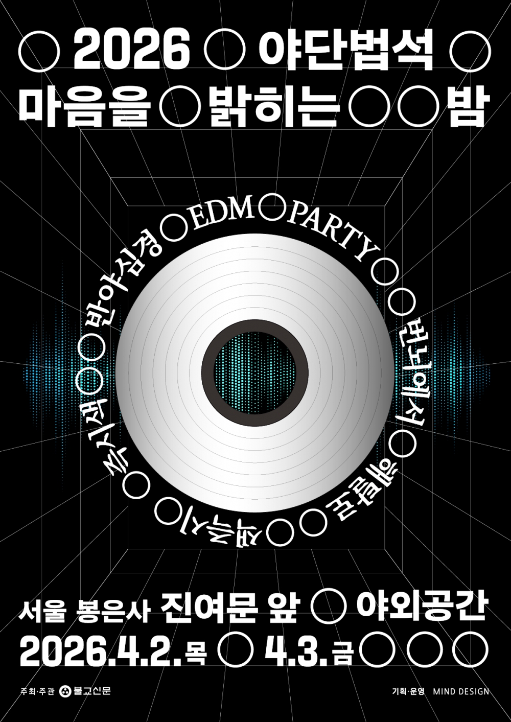 서울 도심 사찰을 무대로 반야심경과 현대 음악, 명상이 결합된 문화 프로그램 ‘2026 야단법석 - 마음을 밝히는 밤’이 오는 4월 2일부터 3일까지 이틀간 서울 강남 봉은사에서 개최된다.
