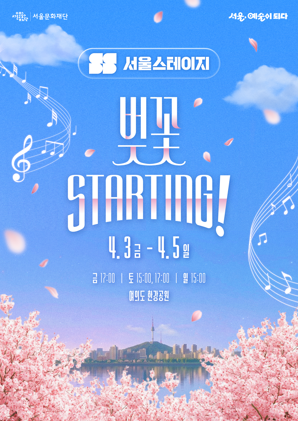 서울문화재단(대표이사 송형종)은 본격적인 봄 축제 시즌을 맞아 <서울스테이지, 벚꽃 starting!>을 오는 4월 3일(금)부터 5일(일)까지 3일 동안 한강 여의도공원 일대에서 개최한다. <서울스테이지>는 분주하고 반복되는 도시의 삶 속에서 서울 시민에게 ‘일상이 곧 예술이 되는’ 경험을 선사하는 기획 공연으로, 올해는 벚꽃이 흩날리는 한강 여의도공원에서 화려한 막을 올린다.