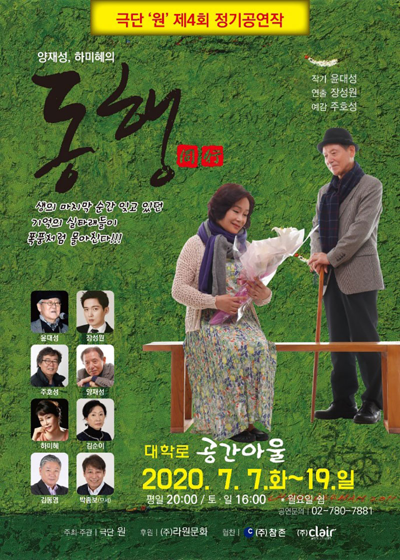‘빨간피터의 고백’, ‘아내의 서랍’, ‘엑스트라’ 등 중·장년층 관객에게 호평을 받아온 극단 ‘원’이 연극 ‘동행(윤대성 작 / 장성원 연출)’으로 실버관객을 찾아 나선다.
