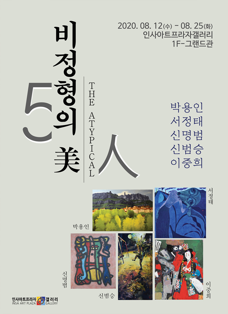서울 인사동 인사아트프라자갤러리(관장 허성미) 1F 그랜드관에서 박용인, 서정태, 신명범, 신범승, 이중희 5人의 ‘비정형의 美’ 전시를 2020년 8월 12일(수) ~ 8월 25일(화)까지 2주간 진행 중에 있다. 이번 전시는 개별적인 조형세계를 선명히 보여주는 원로작가 5人의 대작(大作)으로 구성되어 있으며, 비정형의 세계가 일구어낼 수 있는 회화적인 아름다움의 실체와 그 속살을 들여다보는 독자적인 세계 ‘비정형의 美’ 속으로 관람객들을 초대한다.