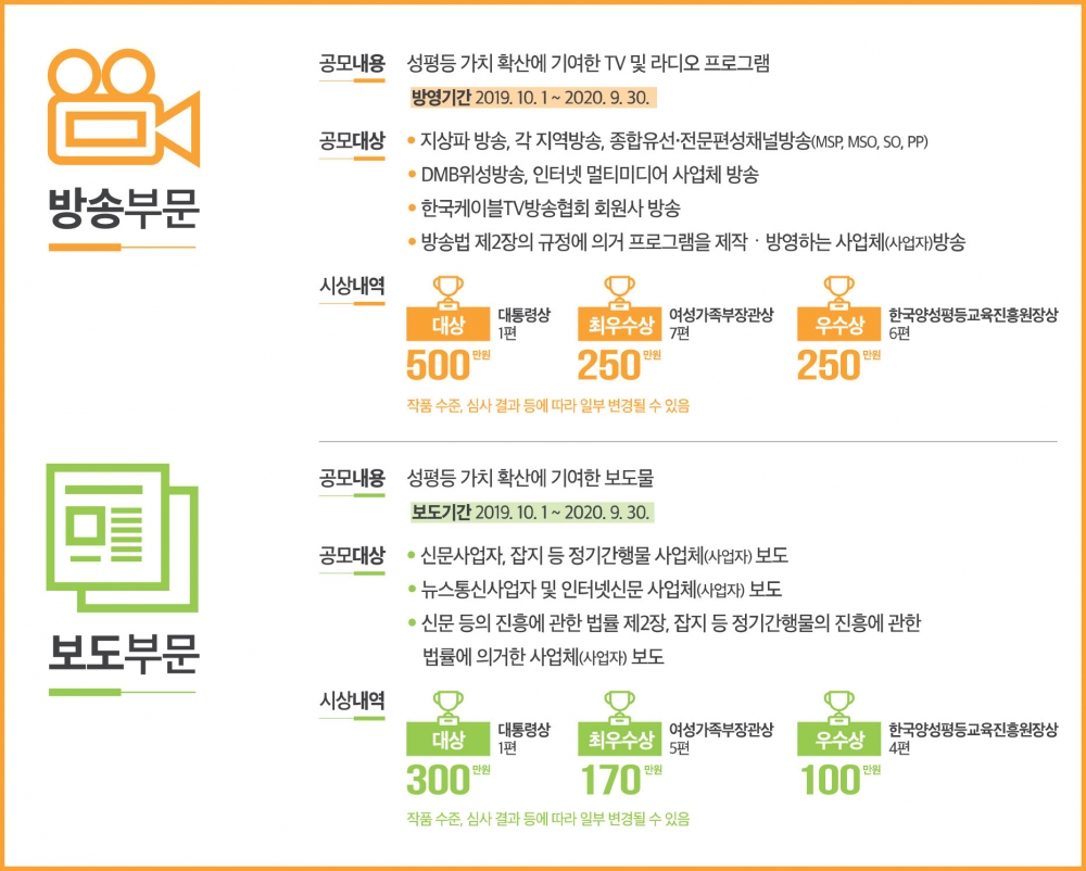 공모는 9월 24일(목)부터 10월 19일(월)까지 약 한 달간 진행되며 한국양성평등교육진흥원 홈페이지에서 출품 서류를 확인 후 웹하드로 제출하면 된다. 공모 대상은 양성평등 실천과 의식 향상에 이바지한 △방송(TV, 라디오) △보도(신문, 인터넷 신문, 잡지 등 간행물 포함) 부문으로 나누어 모집한다.