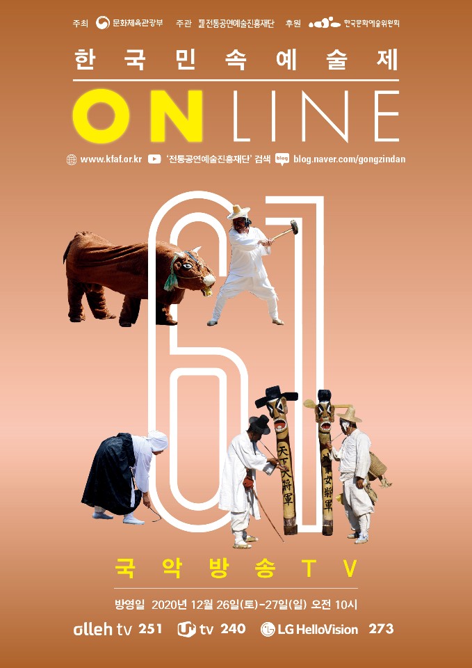 전통공연예술진흥재단(이사장 정성숙)은 국내 최장수 민속축제인 ‘제61회 한국민속예술제’를 12월 21일(월)부터 온라인 축제로 개최한다.