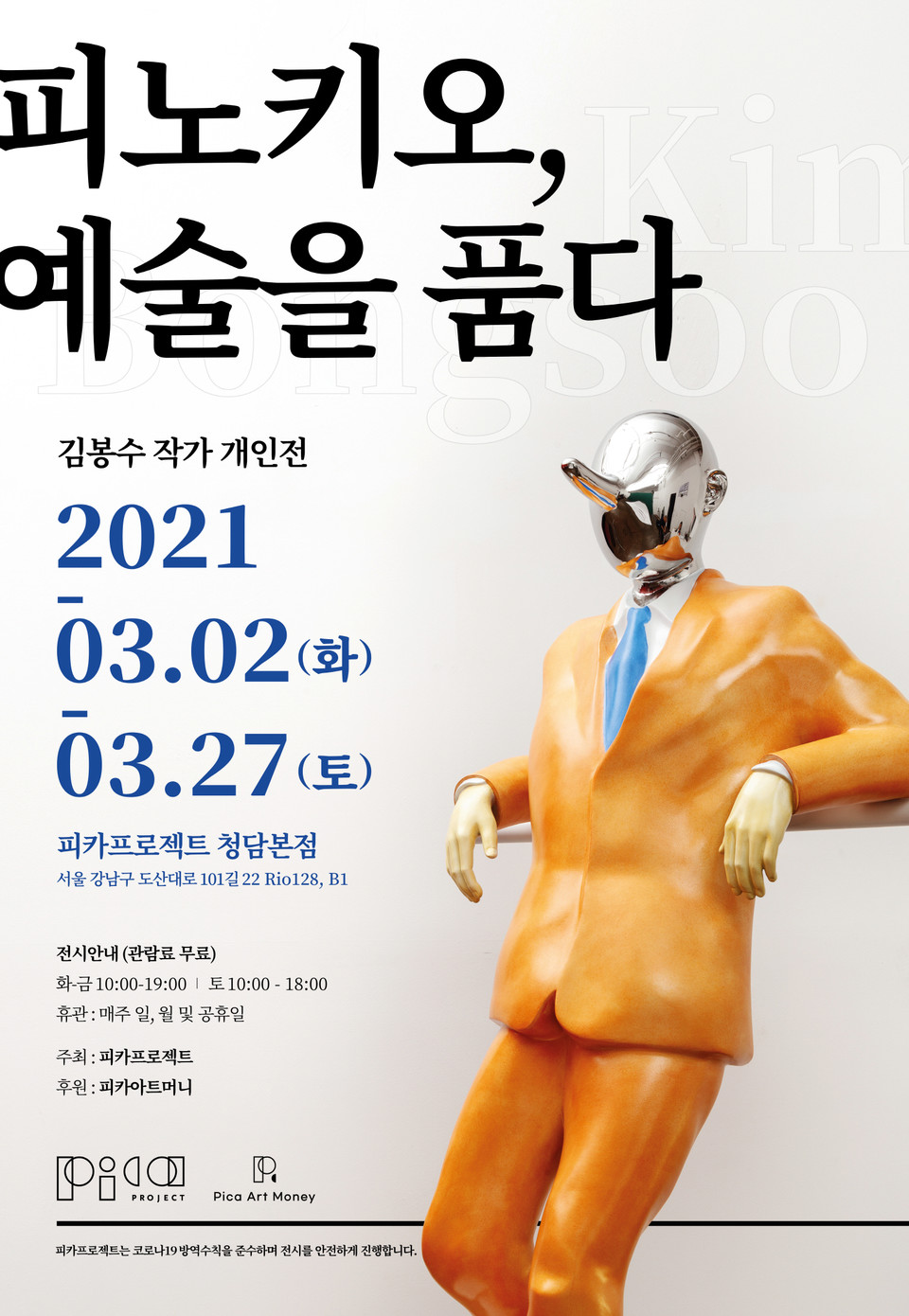 김봉수 조각가는 거짓말을 하면 코가 길어지는 세기의 애니메이션 ‘피노키오’를 활용해 현대인의 욕망과 부, 권력과 욕정을 채우려 스스로를 재포장하는 현대인을 상징적으로 표현한다. 대리석, 브론즈, 스테인리스 스틸 등 다양한 재료를 사용하여 조각가로서 시각적인 감흥을 이끌어 내며 대중과 소통한다. 특히 이번 전시는 피카프로젝트의 유명 작가 소장품과 김봉수 조각 작품을 한자리에 어우러지도록 선보인다. 회화, 입체(조각), 가구와의 컬래버레이션으로 현대미술이 지닌 고유의 융합적 성격과 예술과 일상의 경계를 꿰뚫는 파격적인 시각예술을 연출할 예정이다.