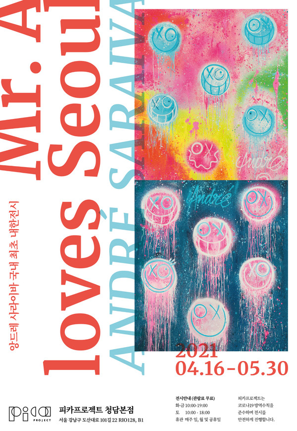 이번 전시는 앙드레 사라이바의 대표적인 페인팅 작업부터 조형물 그리고 피너츠(Peanuts)와 슐츠 어소시에이션(Schulz association)과 함께 콜라보 작업을 한 특별한 작품까지 총 40여 점을 총망라해 작가만의 다양한 색과 세계를 선보일 예정이다. 《Mr. A loves Seoul : 앙드레 사라이바 국내 최초 내한 전시》는 뉴욕을 중심으로 작업한 15점 작품을 먼저 만나볼 수 있고, 이어 5월에 프랑스를 중심으로 작업한 작품 20여 점을 선보일 예정이다.