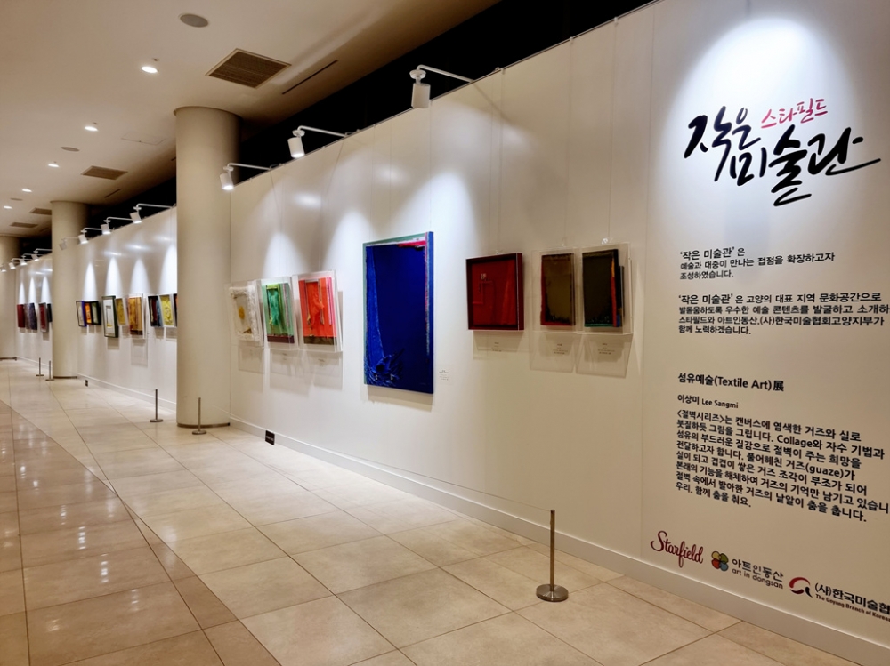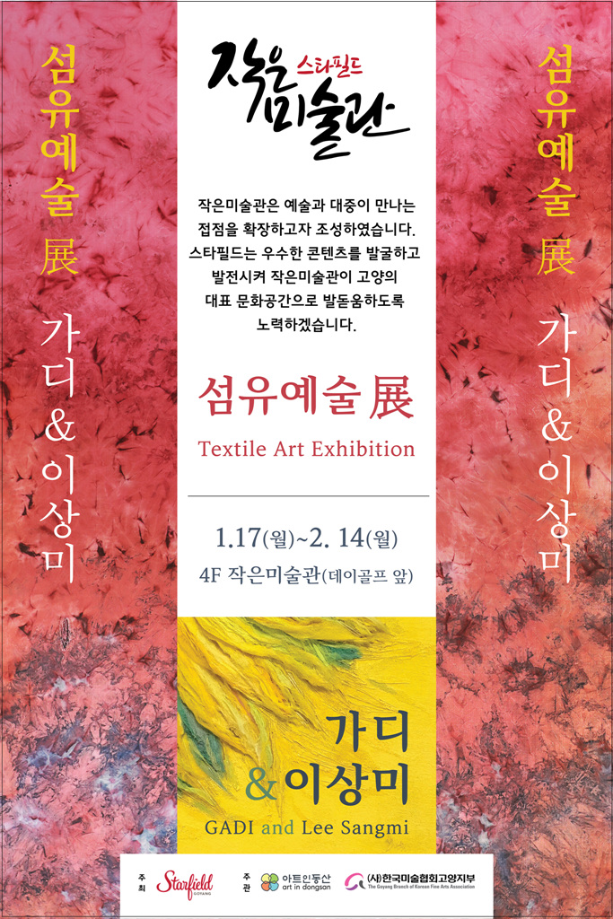 지역의 대표 문화공간으로 발돋움하도록 우수한 예술 콘텐츠를 발굴하고 소개하는 고양 스타필드 4층의 작은미술관은 2022년 1월 17일(월) ~ 2월 14일(월)까지 "섬유예술(Textile Art)展" 타이틀로 전시를 진행 중에 있다. ‘작은미술관’은 예술과 대중이 만나는 접점을 확장하여 가까이 미술품을 즐길 수 있도록 스타필드와 아트인동산, (사)한국미술협회고양지부가 함께 노력하고 있으며 이번 섬유예술(Textile Art)展은 가디(GADI), 이상미(Lee Sangmi) 작가의 2인전으로 관람객을 맞이하고 있다.