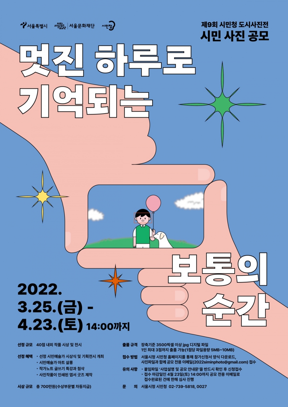 서울특별시 ( 시장 오세훈 ) 와 서울문화재단 ( 대표이사 이창기 ) 은 < 제 9 회 시민청 도시사진전 : 멋진 하루로 기억되는 보통의 순간 >( 이하 ‘ 도시사진전 ’) 공모에 참여할 사진 작품을 25 일 ( 금 ) 부터 내달 23 일 ( 토 ) 까지 접수한다 .