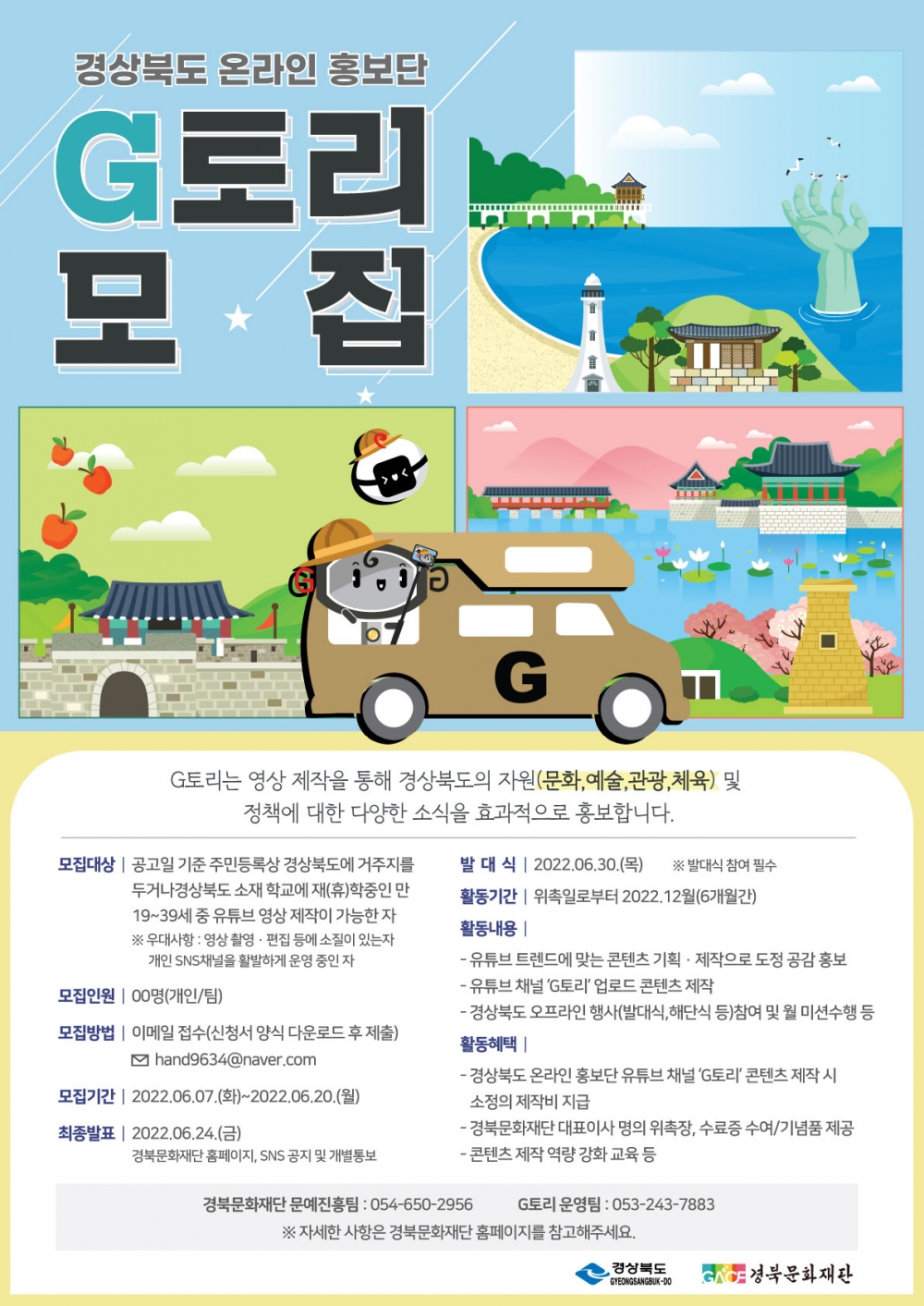 경북문화재단은 2021년 성공리에 활동을 마친 ‘경상북도 온라인 홍보단 G토리’를 올해에도 모집한다고 밝혔다.