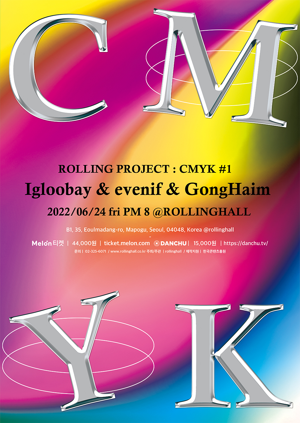 ‘롤링 프로젝트: CMYK’의 대장정 그 첫번째 공연에는 세련된 레트로 사운드가 인상적인 밴드 이글루베이, 제 31회 유재하 음악경연대회에서 두각을 드러내며 인디씬에 등장한 이븐이프, 솔직한 감정과 독보적인 개성으로 자신만의 음악을 들려주는 싱어송라이터 공하임 세 팀의 공연이 오는 06월 24일(금) 오후 8시에 온,오프라인으로 펼쳐질 예정이며 20일 정오에 아티스트 라이브 클립 영상이 롤링홀 sns오피셜 계정으로 공개되고 공연 예매는 오프라인은 멜론티켓에서 온라인은 단추TV에서 가능하다.