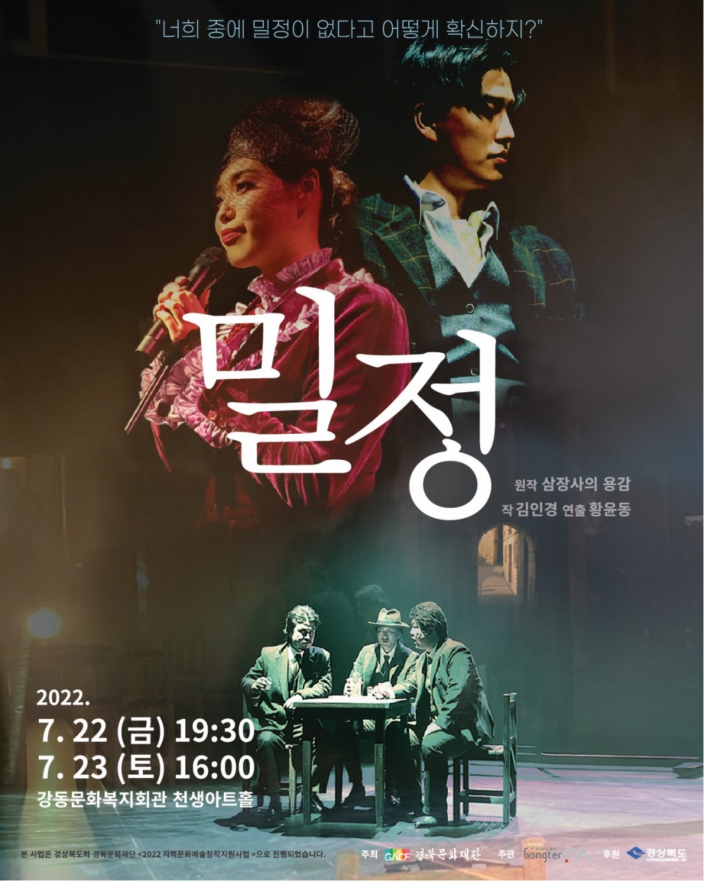 경상북도와 경북문화재단이 진행하는 ‘2022 지역문화예술창작지원사업’에 선정되기도 한 본 연극은 오는 7월 22일 오후 7시 30분과 23일 오후 4시 강동문화복지회관 천생아트홀에서 만날 수 있다. 자세한 내용은 문화포털 <한 눈에 보는 문화정보>에서 확인 가능하다.