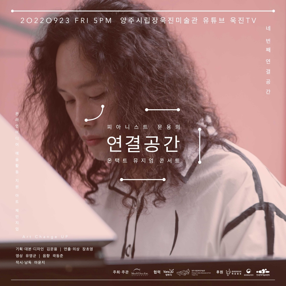 양주시립장욱진미술관 유튜브 채널 ‘욱진TV’를 통해 선보이는 이번 연결공간은 9월 18일까지 개최됐던 2022SIMPLE ‘비정형의 자유, 정형의 순수’ 양주시립장욱진미술관 기획전과 함께한다. 문용은 전시를 주제로 창작한 ‘나는 심플하다’ 등을 포함한 총 9곡의 연주를 선보이며, 유튜브 최초 공개와 함께하는 실시간 채팅에 참여해 관객들과 소통한다.