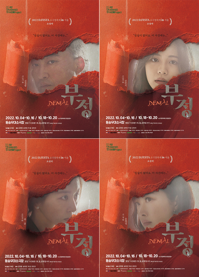 한편, 연극 '부정'(Denial)은 오는 10월16일까지 대학로 동숭무대 소극장에서 본 공연을 끝내고 같은 공연장에서 소극장의 비전과 역할을 함께 만들어가는 대학로의 대표적인 축제인 제16회 D.FESTA 소극장축제 in 서울에 참여한다. (공연은 17일만 공연이 없고 18일~20일까지 공연이다.)