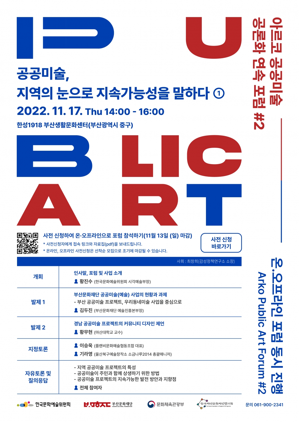 한국문화예술위원회(이하 예술위원회)와 부산문화재단이 공동으로 오는 11월 17일(목), 부산 한성1918 부산생활문화센터 청자홀에서 ‘아르코 공공미술 공론화 연속 포럼 #2 – 공공미술, 지역의 눈으로 지속가능성을 말하다①’를 개최한다.