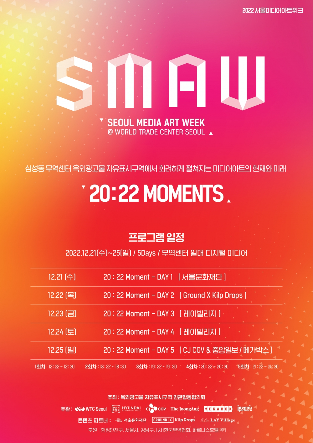 서울문화재단(대표이사 이창기)은 문화예술 공공기관으로는 유일하게 무역센터 옥외광고물 자유표시구역 민관합동협의회(이하 민관합동협의회)가 주최하는 ‘2022 서울미디어아트위크(Seoul Media Arts Week, 이하 SMAW)’에 콘텐츠 협력사로 참여한다. 이는 올해 초 서울문화재단이 발표한 10대 혁신안의 하나로 융복합 예술, 미래예술 콘텐츠 육성과 발굴을 위해 꾸준히 노력해 온 결과이다.