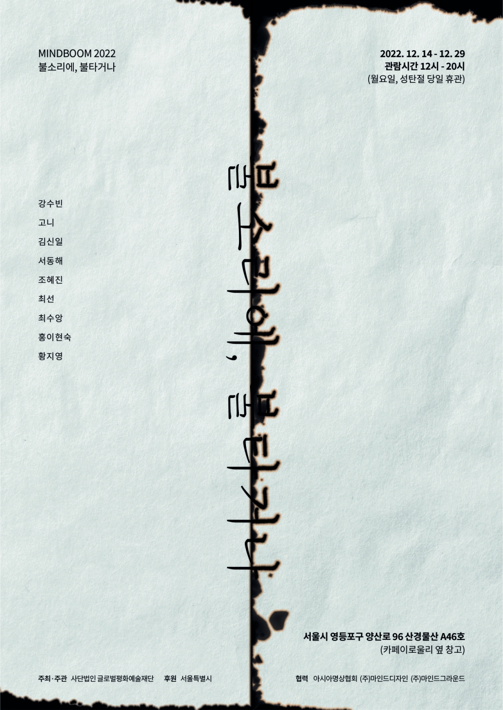 사단법인 글로벌평화예술문화재단은 오는 29일까지 '마인드붐 2022《불소리에, 불타거나》' 예술 감상 워크숍을 진행한다고 오늘 밝혔다.