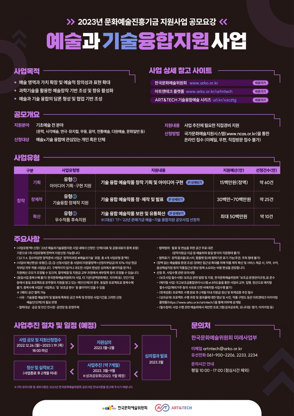 한국문화예술위원회(이하 예술위)는 예술-기술 융합 창작단계를 지원하는 <예술과기술융합지원 사업> 2023년 공모를 추진한다고 30일 밝혔다. 본 사업은 2023년 1월 19일 18시까지 국가문화예술지원시스템(NCAS)을 통해 지원신청 가능하다.