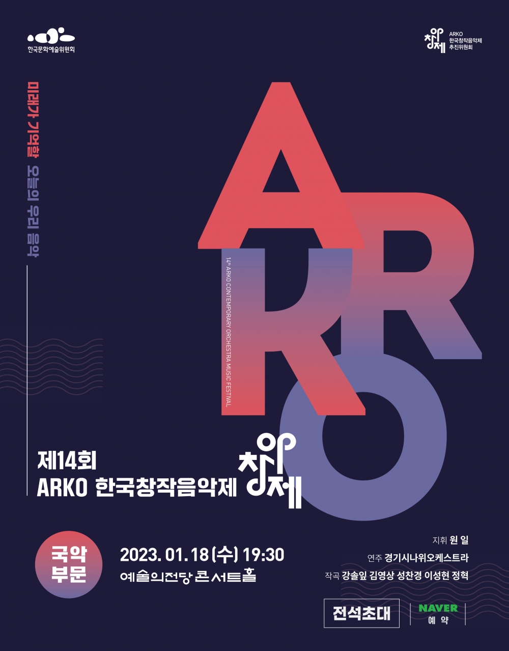 한국문화예술위원회(이하 ARKO)와 한국창작음악제추진위원회(이하 아창제)가 주최하는 대한민국의 대표적인 창작음악제인 ARKO한국창작음악제 국악부문 선정작품 연주회가 2023년 1월18일(수) 오후 7시30분 예술의전당 콘서트홀에서 열린다.