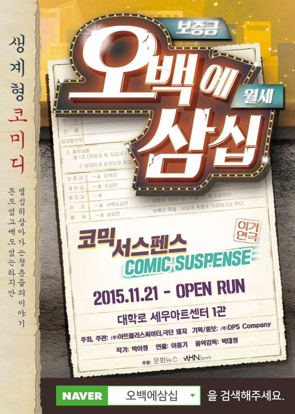 공연 제목에서 알 수 있듯, 보증금 500만 원에 월세 30만 원짜리 돼지 빌라에 사는 주인공들의 이야기를 다루고 있는 생계형 코미디 연극이다.