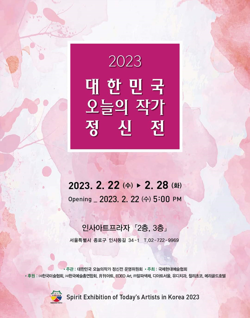 올 한해 한국미술의 방향성을 가늠하고 현재 활발하게 활동 중인 전업 작가들의 작품을 감상할 수 있는 "2023 대한민국 오늘의 작가 정신전"이 2023년 2월 22일(수) ~ 2월 28일(화)까지 서울 인사동 인사아트프라자에서 진행 중에 있다. 약 200여명의 작가들이 한국미술의 중심 인사동에서 서양화, 한국화, 수채화, 문인화 등 다양한 장르의 미술작품들을 최신작 위주로 전시하고 있다.