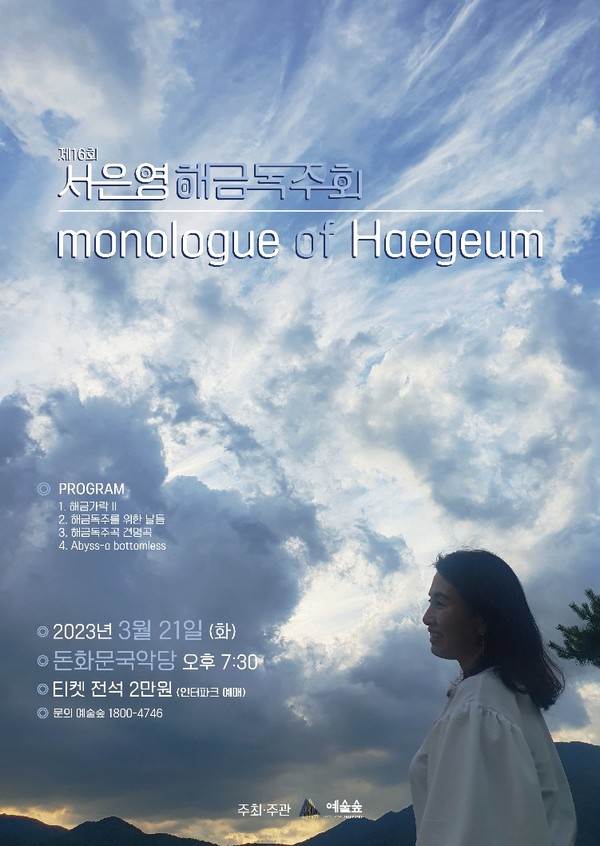 공연문화를 선도하는 문화예술콘텐츠 기업 ㈜예술숲(대표 김면지)은 3월21일 오후7시30분 서울돈화문국악당에서 열리는 해금연주자 서은영의 해금독주회<Monologue > 소식을 전해왔다.