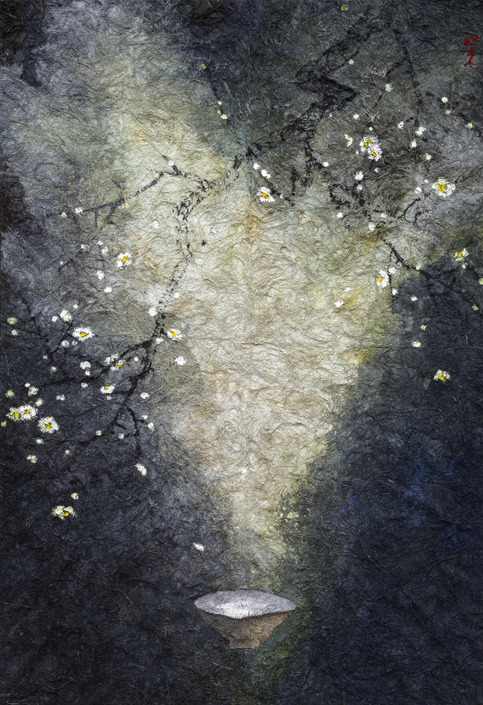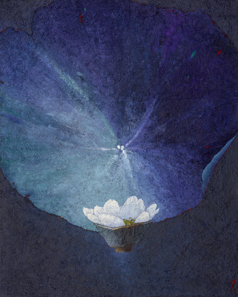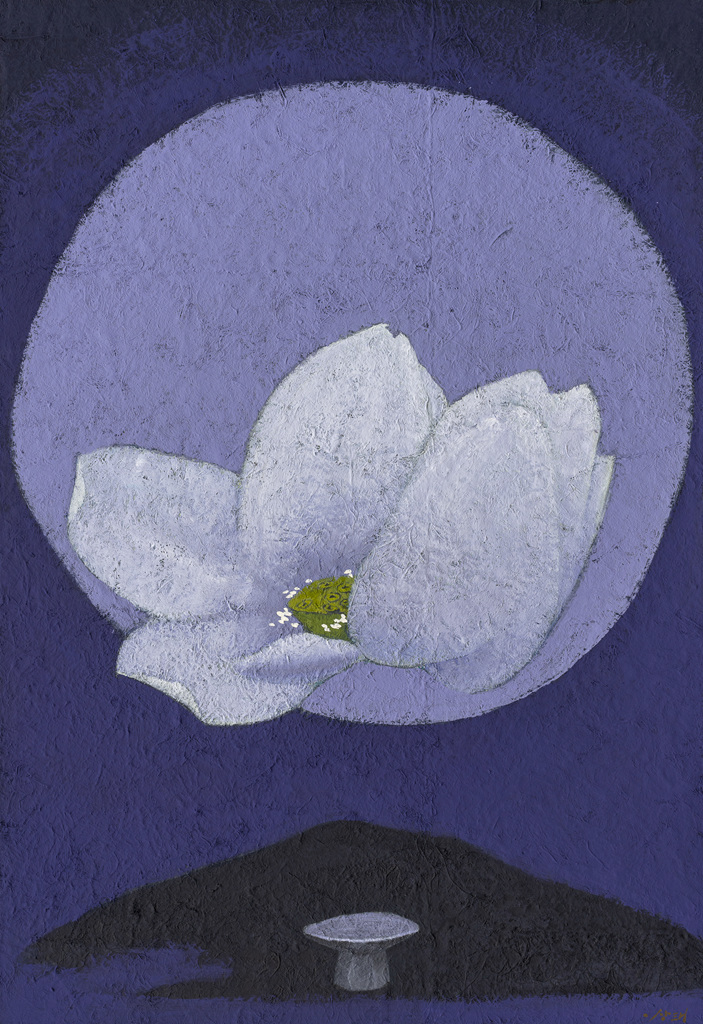 특히 심사도(尋思圖) 시리즈 중에 '헌화(獻花)' 작품은 은혜로운 어머니에 대한 사랑 이야기다. 둥근 달은 어머니의 얼굴이기도 하고, 그리움이기도 하다. 좋은 추억만을 간직하고 싶고, 보답 못한 안타까움과 미안함을 고스란히 담았다. 애틋한 어머니의 정은 영원히 사라지지 않는 달과 같이 우리 마음속 깊이 간직되어 삶을 이어가는 원동력이 된다. 한국화의 일반적 이미지 소재이지만 간결한 선과 몽환적 채색이 그림을 아름답게 만들어 중심으로 빨려 들어가게 하는 흡인력이 강하다. 또한 무지의 여백이 아닌 색으로 채워진 여백의 고요함이 큰 울림을 준다.