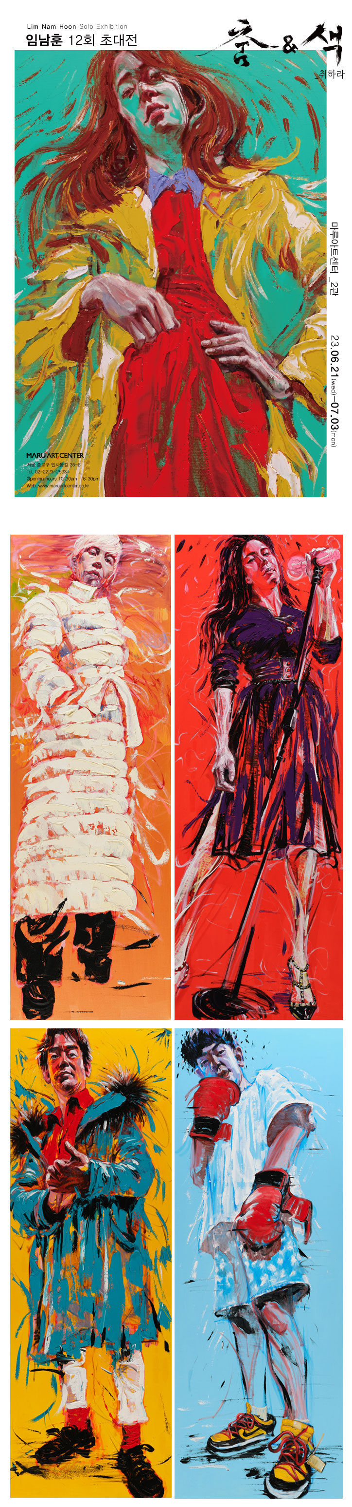 사람 내면의 진실한 본성을 찾아내고 보여 지는 특징을 부각하여 캔버스에 담아내는 인물화가 임남훈 작가는 오는 2023년 6월 21일(수) ~ 7월 3일(월)까지 서울 인사동 소재의 마루아트센터 2관에서 "춤 & 색 취하라" 타이틀로 초대 개인전을 진행한다. 힘차고 당당한 포즈의 인물 스케치는 선 굵고 묵직한 채색으로 입혀져 그림에서 강력한 힘이 느껴지고, 인물의 시선을 따라가면 자신과 대비되는 성향들을 발견하여 전신 일물화의 매력을 체험한다. 냉철한 작가의 시선으로 작품 속 주인공들의 잠재된 본능과 밖으로 표출되는 고고한 분위기를 포착하여 작품을 완성했으며, 발색되는 색채의 힘도 강력하다.