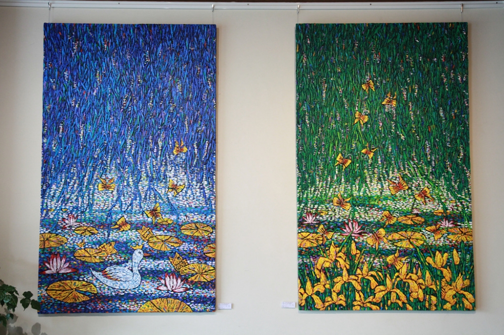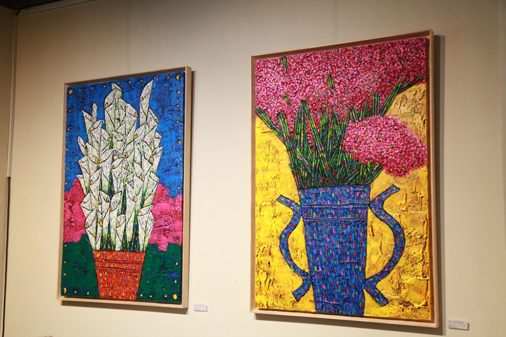 화면 가득 채운 수련의 모습은 한 여름 싱그러움을 연상하게 하며, 큼직한 화병에 담은 풍성한 꽃들은 행복 머금은 미소로 감상자와 눈 맞춤을 한다. 작품을 제작했던 당시의 기쁜 마음을 나누고자 하는 선한 심경이 느껴질 정도로 좋은 에너지를 발산되어 평온한 작가 일상이 엿 보인다. 선한 마음의 표현이 붓과 나이프 끝에 전달되어 무아지경 속에 천천히 구사된 형상들은 달콤한 사탕을 먹듯 그림이 아름답다. 이번 전시에 출품된 모든 작품들이 원색의 기본색상을 사용하여 전달력 또한 우수하다.