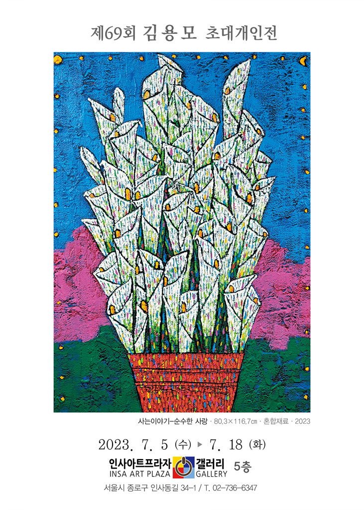 캔버스 전체에 질감이 강조된 마띠에르 위에 화분에 담긴 화초 그리고 화병 속의 풍성한 꽃들의 이미지는 감상자들에게 힐링을 선사한다. 김용모 작가는 선 굵은 이미지의 윤곽이 명확성을 주고, 고유의 속성과 성질을 선명하게 하는 그림으로 2023년 7월 5일(수) ~ 7월 18일(화)까지 서울 인사동 소재의 인사아트프라자갤러리 5층에서 "제69회 김용모 초대 개인전"을 진행 중에 있다. 군더더기 없는 세련된 채색으로 화사한 꽃들의 향연이 제대로 표현되어 감상자의 시선을 오래 머물게 한다.