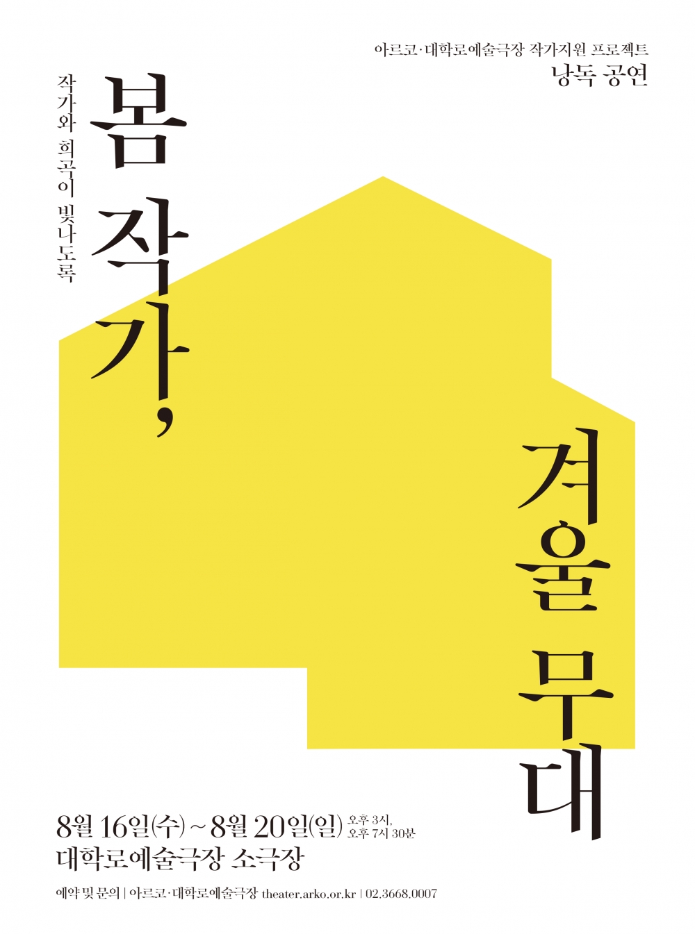아르코․대학로예술극장(극장장 강량원, 이하 예술극장)은 오는 8월 16일(수)부터 8월 20일(일)까지 대학로예술극장 소극장에서 2023 ⌜봄 작가, 겨울 무대⌟ 낭독공연을 선보인다.