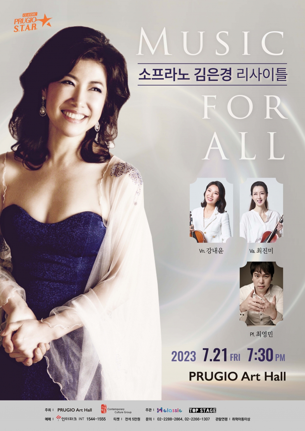 김은경은 7월 21일 서울 중구 푸르지오아트홀에서 리사이틀 ‘뮤직 포 올(Music for All)’을 전석 매진으로 마쳤다. 푸르지오아트홀과 현대문화가 주최하고, 한클래식과 탑스테이지가 주관한 이 공연은 명칭에서부터 드러나듯 ‘모든 이가 즐길 만한 친근하고 재미있는 음악’을 표방해 관객에게 어필했다. 김은경의 음색을 그리워하고 기다리던 팬들에게는 단비 같은 공연이 됐다.