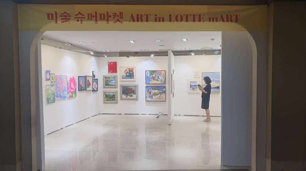 ▲사진=롯데마트 송파점에 마련된 특별전시장에서 관람객이 미술품을 관람중이다. / 출처: 미술로