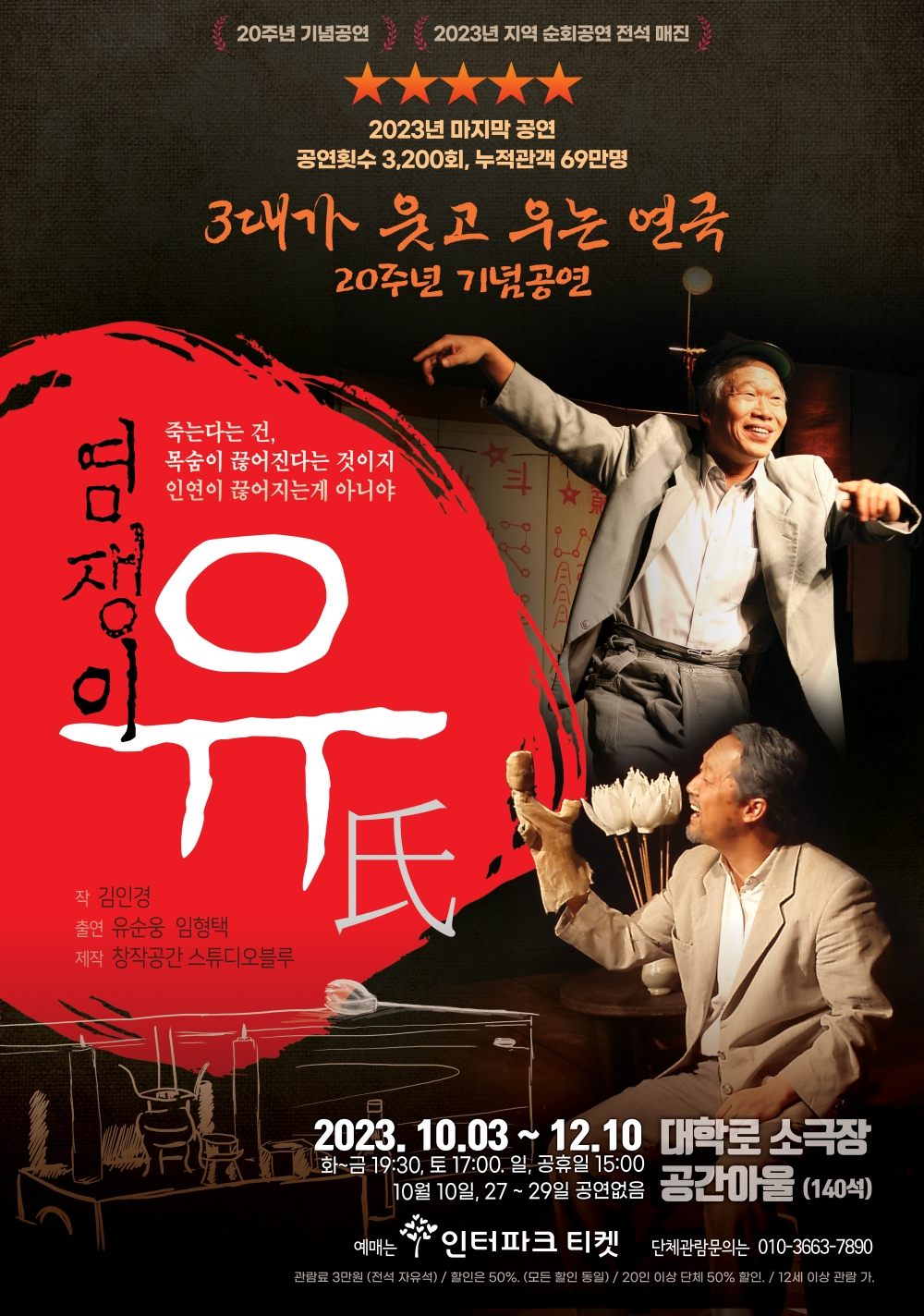 창작공간 스튜디오블루(대표 하형주)는 10월 03일부터 12월10일까지 서울 대학로 공간아울극장에서 '염쟁이 유씨' 20주년 기념 공연을 한다고 밝혔다.